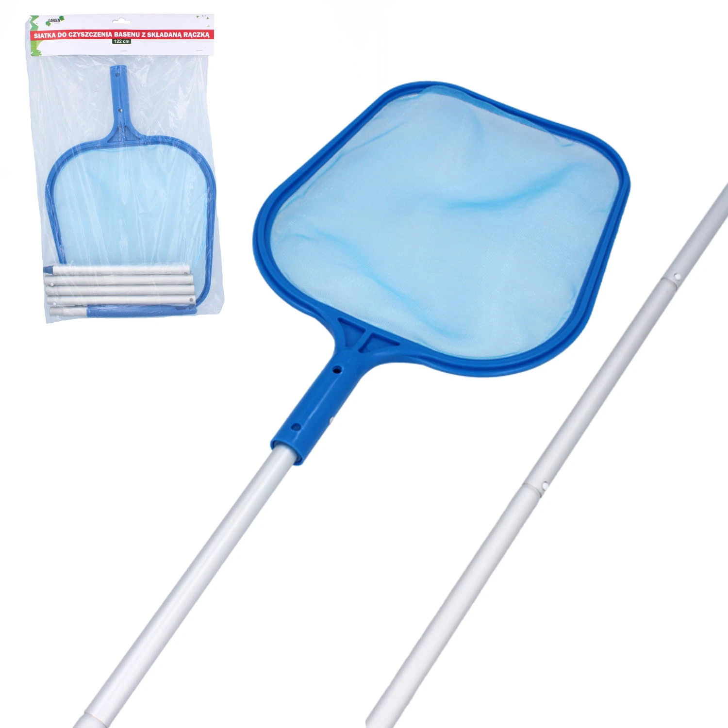 Praktyczna siatka do wyławiania zanieczyszczeń z basenu z teleskopowym kijem. Niezbędne narzędzie do utrzymania czystości wody w każdym basenie.