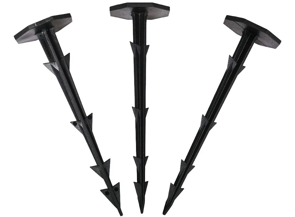 - Do mocowania agrotkanin i agrowłóknin – zapobiegają ich przesuwaniu się na wietrze i nierównym terenie.